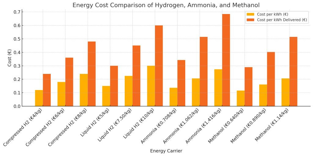 - At €8 per kg of hydrogen and €100 per ton of CO₂, methanol costs €1.14 per kg, resulting in €0.206/kWh, and at 40% combustion efficiency, the effective cost per kWh delivered is €0.515.